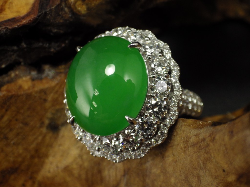 種色俱佳的翡翠葫蘆蛋面戒指,迷人的翠綠色加上接近玻璃種的質地,此般品質的翡翠寶石飾品在珠寶市場上的價格,動輒數百萬仍供不應求。